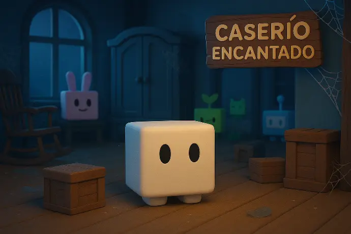 MINIBOO es un mini cubito blanco, suave y casi translucido. MINIBOO vive en el CASERÍO ENCANTADO del MINIVERSO, donde aparece cuando baja la luz del sol y deja notitas con dibujos en cajas. Es tímido, dulce y escucha mejor que nadie. Con él, hasta los silencios son tiernos.